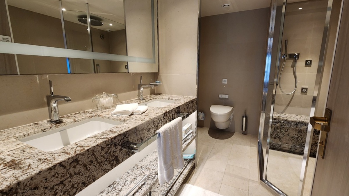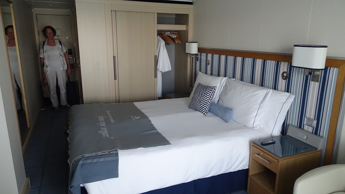 Gail has strong opinions about the bathrooms. Our Crystal bathroom was huge, with two sinks. But Gail thought the shower was too big – she had to walk across the stall to turn the water on, then walk back to get under the showerhead. And there were some Viking features she missed: the under-counter drawers, heated floor and no-fog mirror.
