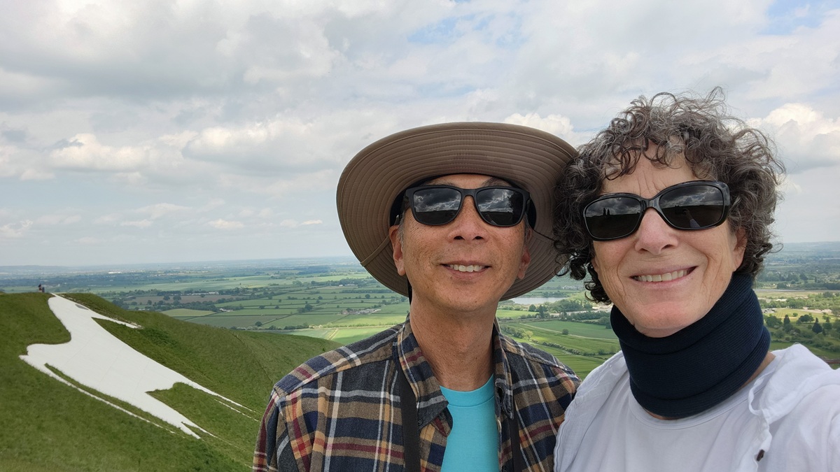 First: on the road atlas, Gail saw a site of interest labeled “White Horse” outside of Westbury. Kathy (who knows everything about the area) told us it is one of those gigantic chalk drawings high up on a hillside. We drove on a narrow road up a steep hill to see it, but we had a lovely walk.