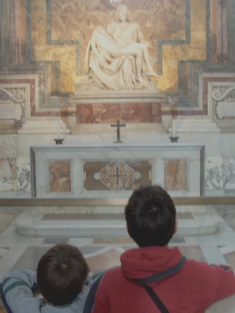 The Basilica itself is gigantic, running the length of two football fields (on the inside floor, there are plaques marking how tiny many other famous churches -- including London's St. Paul's Cathedral and Firenze's Duomo -- would be if they were placed inside thee Basilica), although it was purposely designed to look much smaller than it actually is. Originally designed by Michelangelo, the cross-shaped church and its cupola (dome) are ornate and impressive beyond words. As Rick Steves says, "to call it 'vast' is like calling God 'smart'." Highlights include Benini's bronze canopy over the central altar (which is actually the height of a seven-story building), a painting of St. Peter's crucifixion on the actual spot where it occurred, and Michelangelo's famous sculpture of St. Mary cradling her dead son, the Pietą (it is now housed behind bulletproof glass, after a vandal almost destroyed it in 1972).
