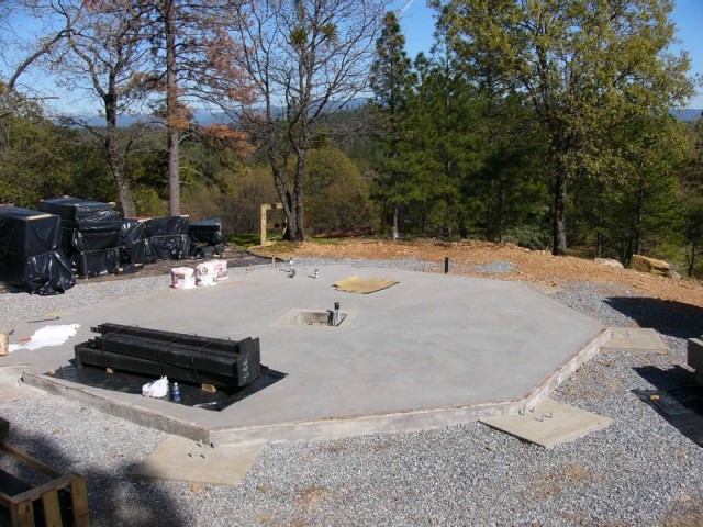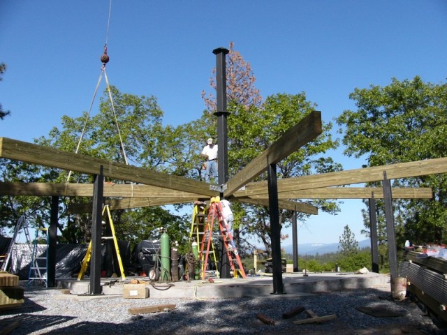 Next came the eight gigantic glu-lam beams. If you think of the octagonal house as a large wheel with the center column as the axle, then the glu-lam beams are the spokes. They connect the center column to each of the corner posts about ten feet above the ground, creating the foundation for the second floor.