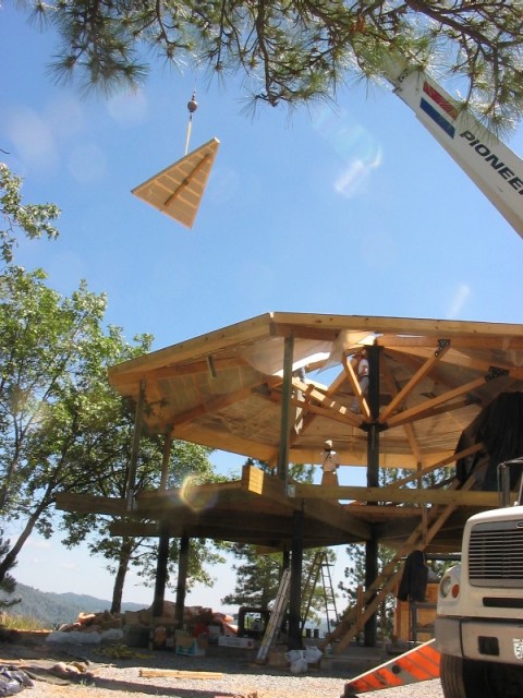 With the center cap now filled with insulation, it was time to install the last eight roof panels -- the triangular "pie wedges." These needed special attention. How do you attach crane straps to a triangle? In fact, how can you even remove the straps once the triangle has been set upon the roof beams?