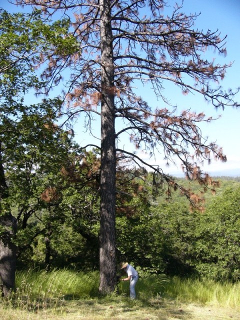 As usual, Matt took responsibility for the last task of the day. Several months ago, we had noticed that one of the 60-foot trees next to the building site had died. At first we thought that one of the roots had been cut accidentally during the installation of the septic system. Dennis the Building Inspector told us that it was caused by a tree-eating beetle, and that we should remove the tree before the beetles migrated and killed another one.