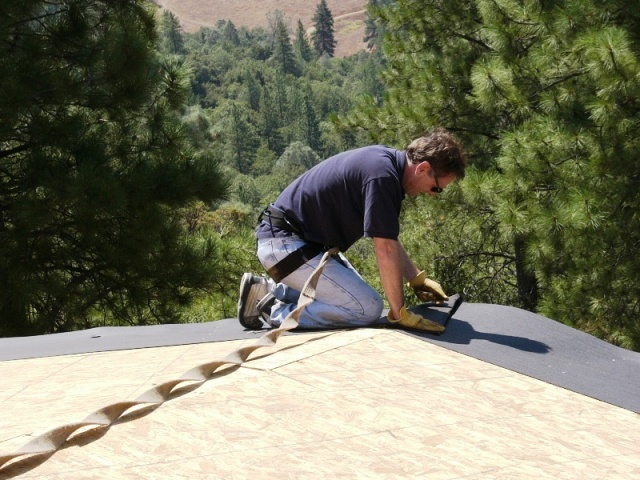 The next task was to roll tar paper over the wooden roof panels. Topsider had specified 15-lb paper, while the metal roofing company had specified 30-lb. Gail had purchased 30-lb, mainly because it was the only grade available at Home Depot. She had purchased five rolls, which Home Depot assured would be more than enough. In addition, Gail had purchased a couple of "staple hammers." These handy devices, easier to use than a two-handed staple gun, enabled you to staple simply by striking the hammer against a hard surface.