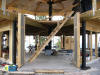 What followed was nine hours of readjusting straps, re-setting both the winch and Steve's comealong, re-nailing the skis, re-building the skis, and clearing a lot of gravel out of the way. Russell marveled at Steve's seemingly infinite patience and meticulousness. Every time the winch needed to be re-set (which was often), Steve approached it with the same analytic care and safety. We had to adjust the wall slightly to one side so it would avoid hitting two of the protruding glu-lam beams. Every time we moved the wall at an angle against the skis, the skis would buckle and have to be rebuilt. We probably went through three pounds of double-headed toe nails reinforcing and rebuilding the skis.