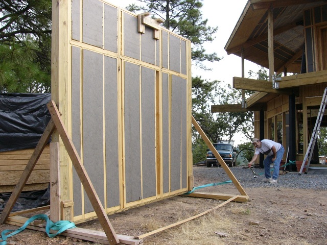 On Sunday evening, August 14, after a night and a day by himself, Russell welcomed the arrival of his friend Steve. Steve's original expectation had been to put tar paper on the roof, so he was naturally disappointed to find out it had already been done. However, Russell had an even better task for the two of them: position and install the eighth and final lower-story wall panel.