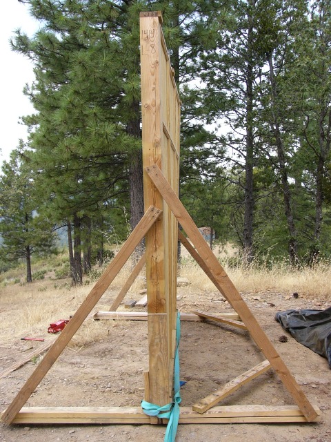 We had always known that the eighth wall panel would be problematic. As one of the only two completely solid walls in the entire house, it was massively heavy. (The pantry/bathroom wall was lighter -- it had a window -- but it could barely be lifted by the combination of Steve, Russell, Gail, Cameron, and Joss.) Because we had only Steve and Russell for muscle power, we decided to try a different process. We would put the wall on wooden skis, and tow it using Steve's truck winch.