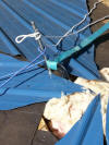 Problem #2: Once we closed the hole, how would we tie our safety lines? Russell fastened a couple of 9-inch cast-iron C-clamps directly at the apex of the roof, and tied the safety lines to them. They had no problem holding our weight.