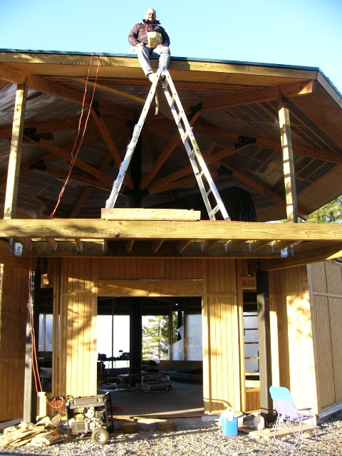 On September 9-11, Russell returned to the mountain, this time with Gail and the boys. Russell's intention had been to work further on installing the decks around the perimeter of the house. Gail, however, was very insistent that she wanted to work on the roof. Despite her fear of edges, she really wanted to challenge herself... as well as claim credit for having worked on every aspect of construction.