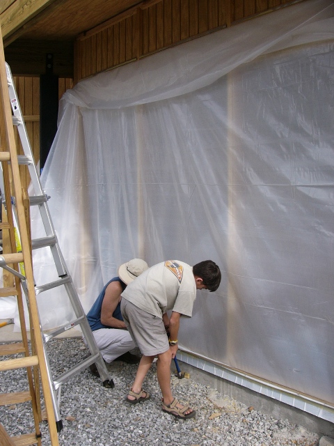 Our plan was to wrap the sides of the house in plastic. In fact, a month ago Gail had stapled pieces of plastic around the perimeter of the lower story, but these had been destroyed by wind in a matter of weeks. We would need to use one long continuous piece of plastic, and secure it in place with boards as well as staples.