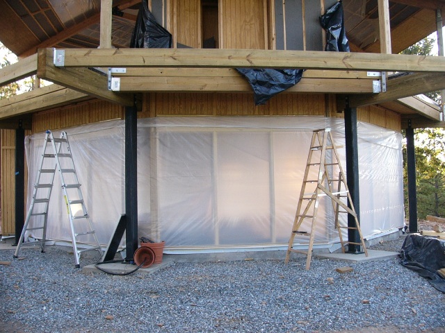 On October 1-2, we made one more trip to the mountain to do just that. Using a long roll of opaque white 6-mil plastic sheeting (doubled over), we spent Saturday morning wrapping the lower story of the house in plastic. It took all four of us to work with the plastic but it worked beautifully.