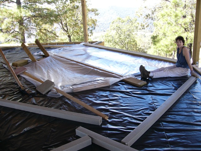 It would take another weekend trip from Russell, Gail, Cameron, and Joss to accomplish task 2: making the entire house watertight. With the roof covered, we wouldn't have to worry about rain falling vertically into the house. However, our mountain-top at 2,700 feet can experience winds of more than 100 mph, making the rain fall almost sideways. On the lower story we had installed walls but no windows; on the upper story we had installed nothing at all.