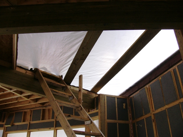 The result was a lower story that was wind and rain proof, but would still retain heat so that we could continue to camp inside the house. Although the white opaque plastic kept the space brightly lit, we could no longer see outside. So for the three lower-story windows, Gail installed clear plastic. She even rigged a clear plastic front door that could be propped open or swung closed.