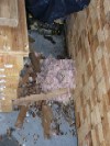 But the most unsettling issue was that, in the middle of the night, we began to hear tiny feet scampering about near our heads in the tarp-covered lumber piles. Apparently we were not alone – some small rodent had made a home here during the Winter. As we uncovered the lumber piles, we found a piece of insulation that had been formed into a nest, surrounded by empty acorn shells and rodent droppings.