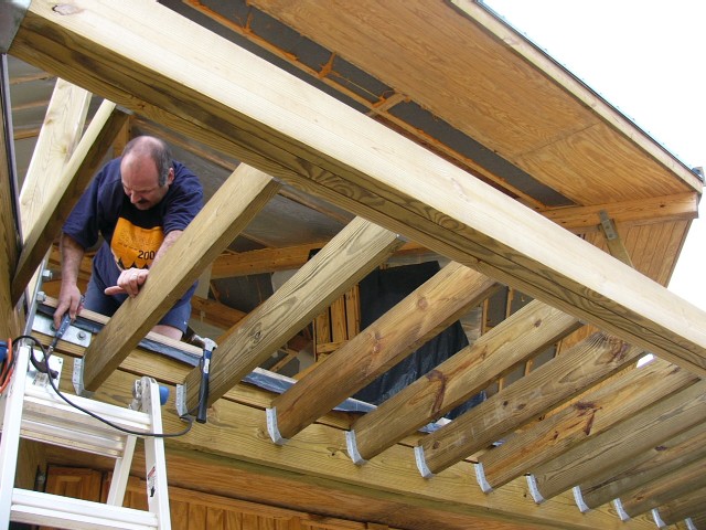 As usual, Russell and Steve worked well together, developing a process that worked like clockwork. By Monday afternoon, we had not only completed the first section, but we had gotten three joists ahead on the second section.