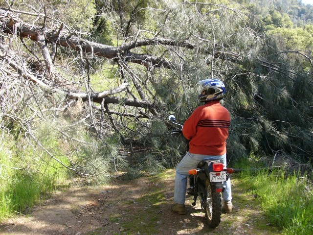 The end of a nice motorbike ride: Steve encounters a fallen tree