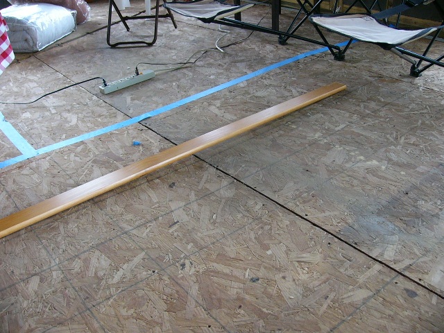 In the finished house, this spot occurs between the master bathroom and the upstairs sitting room. In the construction, this is the spot where – in April 2005 – we had placed a pallet containing all eight upstairs walls. The pallet ended up sitting there for more than a year on its wooden skids, slowly making the floor joists beneath warp under the weight. With the upstairs walls now happily installed, the sag in the floor unhappily remained.