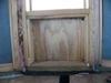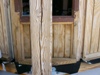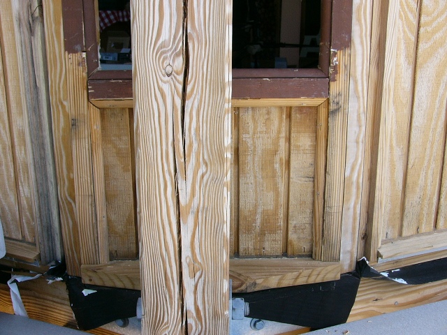 The re-carpentered wall as viewed from the outside. The dark brown stain shows that the opening used to be two inches higher. The old dado slots have been filled in with trim wood.