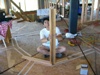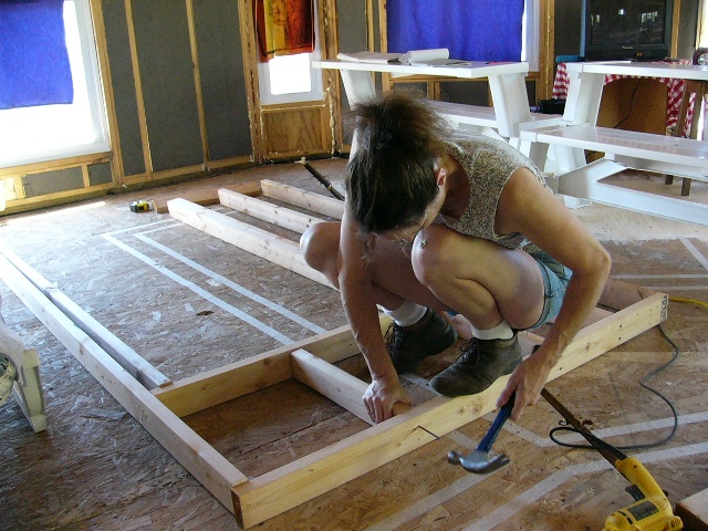 Gail uses her step-father's chop saw to cut wood, then assembles the pieces