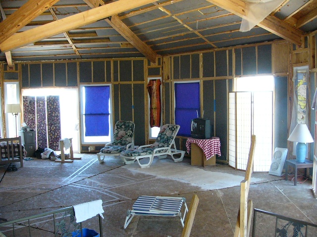 We had come up during a hot spell in the weather, and our typical working day was 85-90º inside the house. We were still able to walk around quite comfortably at midnight in shorts and T-shirts. With her usual ingenuity, Gail improvised several comforts. She regularly covered the inside windows with towels, sheets and screens. We ate our lunches outside under a set of water misters that Gail had installed under the decks overhead. (It was even hotter in town – we registered a high of 108º in the valley.)