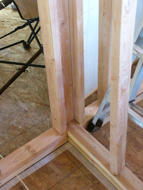 The first error was that we had cut the top plates of our walls in sections that corresponded to the walls themselves. Instead, we should have staggered the top plates, so that they would overlap the walls and make the whole structure stronger. (Think of how a brick wall is properly constructed – each row of bricks staggers the bricks below it).