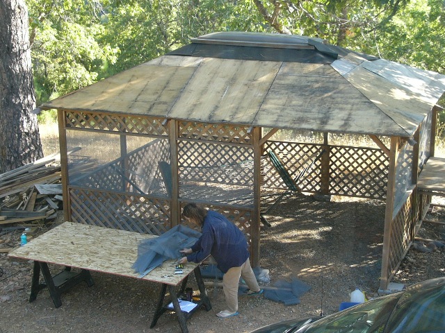 Unfortunately the walls were now assembled, so Gail had to insert new studs after the fact, by shoving them into place and then toe-nailing them. Gail also had time to rig better sun shades for the windows out of aluminum foil, and put bug netting around our latest gazebo.