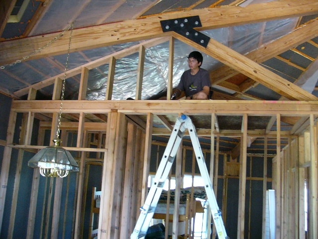 The dependencies continued. Before we could put the bathtub in the bathroom (from which we could never remove it), we had to install a second sub-floor of OSB underneath. In addition, Russell decided that we should finish all construction above the bathroom ceiling, so that we would not accidentally drop something and break the bathtub.
