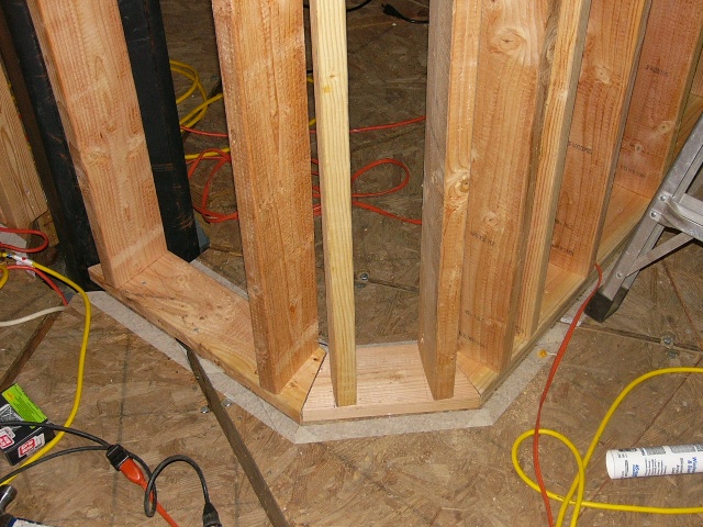Meanwhile, Russell installed the last two interior walls of the upper story. These walls both required strange measurements and cuts – one was a narrrow diagonally-angled corner for the hallway; the other ran into the center pole – so it was a one-person job.
