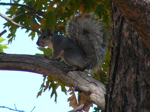 On the wildlife front, we seem to have been adopted by a squirrel. He likes to play around in the wood pile when we're not looking, then he runs up onto this branch and spies down on us.
