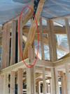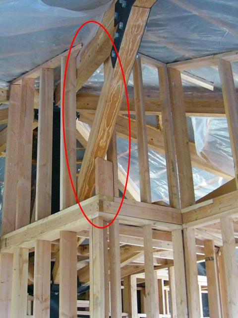 The solution: Russell installed "girdles" above and below the knee braces (red circles). When we install drywall in the future, we can attach it to these girdles.