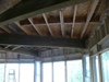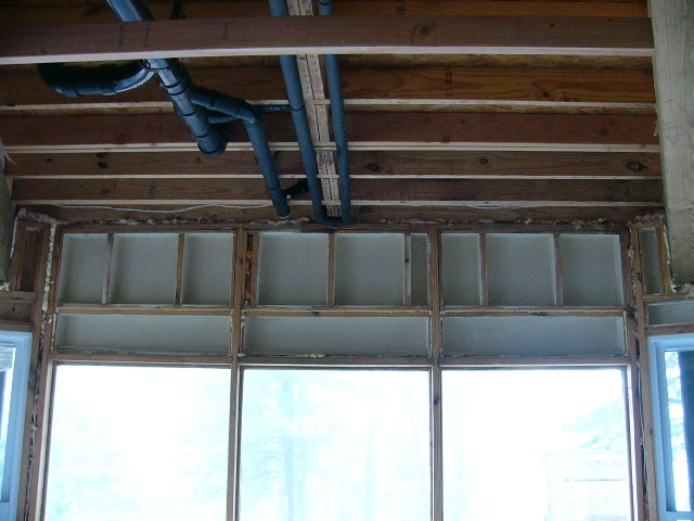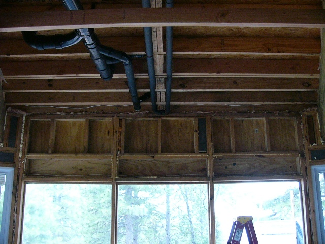 The southwest ceiling and wall, showing the overhead plumbing where a drop ceiling would be required. Before we could construct a brace across the wall, step one would be to remove all of the insulation blocks.