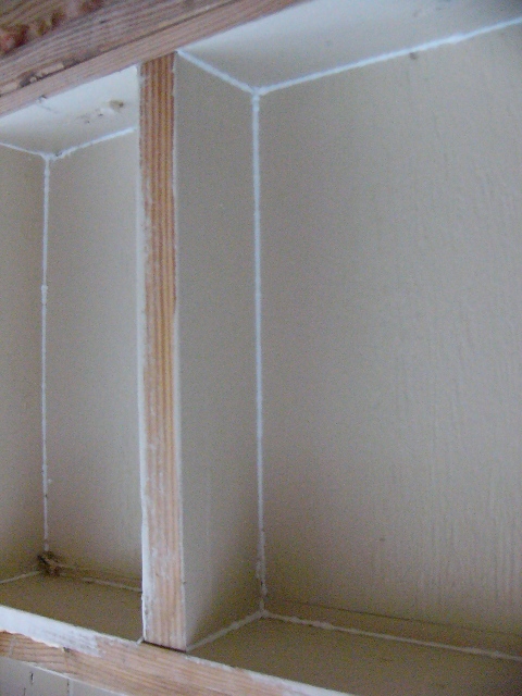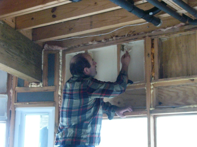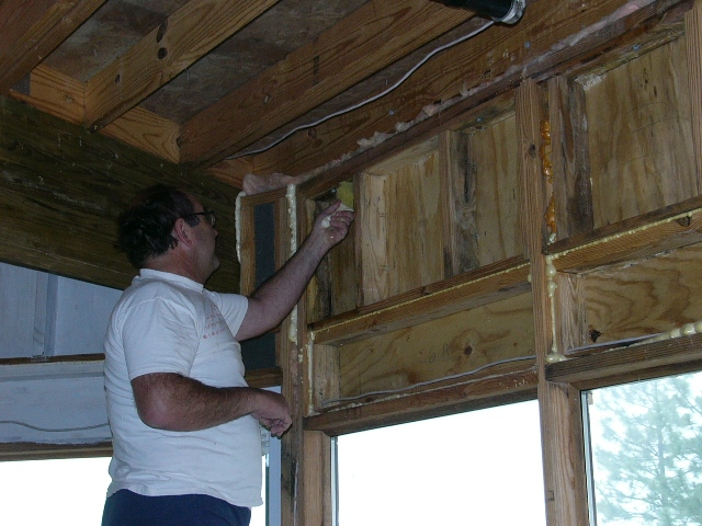 The situation has turned into Gail’s “personal hell.” She is meticulously going through every external wall, staining the wood, removing trimwork and caulking seams. When the weather has been too cold outside she has worked inside, removing blocks of insulation and bleaching the walls. In the last several months, Gail has also begun coating the insides of the walls with enamel paint to create a further water barrier.