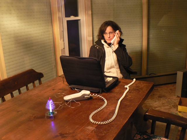 Gail calls home using the MagicJack. (Note the USG Christmas tree. ’Tis the season!)