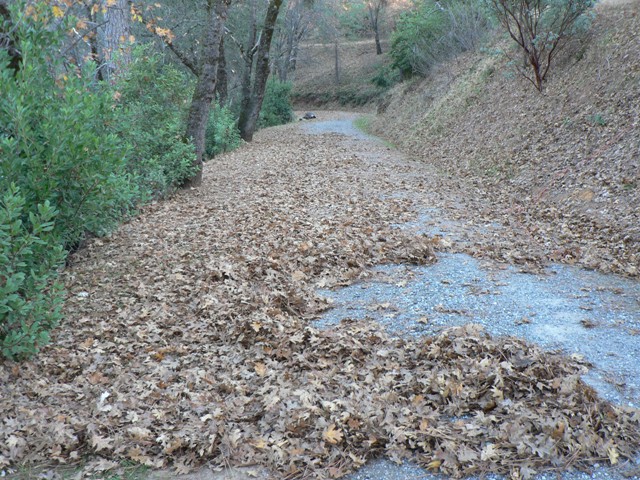 Gail’s pet project for the weekend was to rake the approach road. With the arrival of winter, the hundreds of oak trees around the property all drop their leaves. This is especially troublesome on the main gravel approach road, where a layer of leaves can make the road too slick to drive on when it rains.