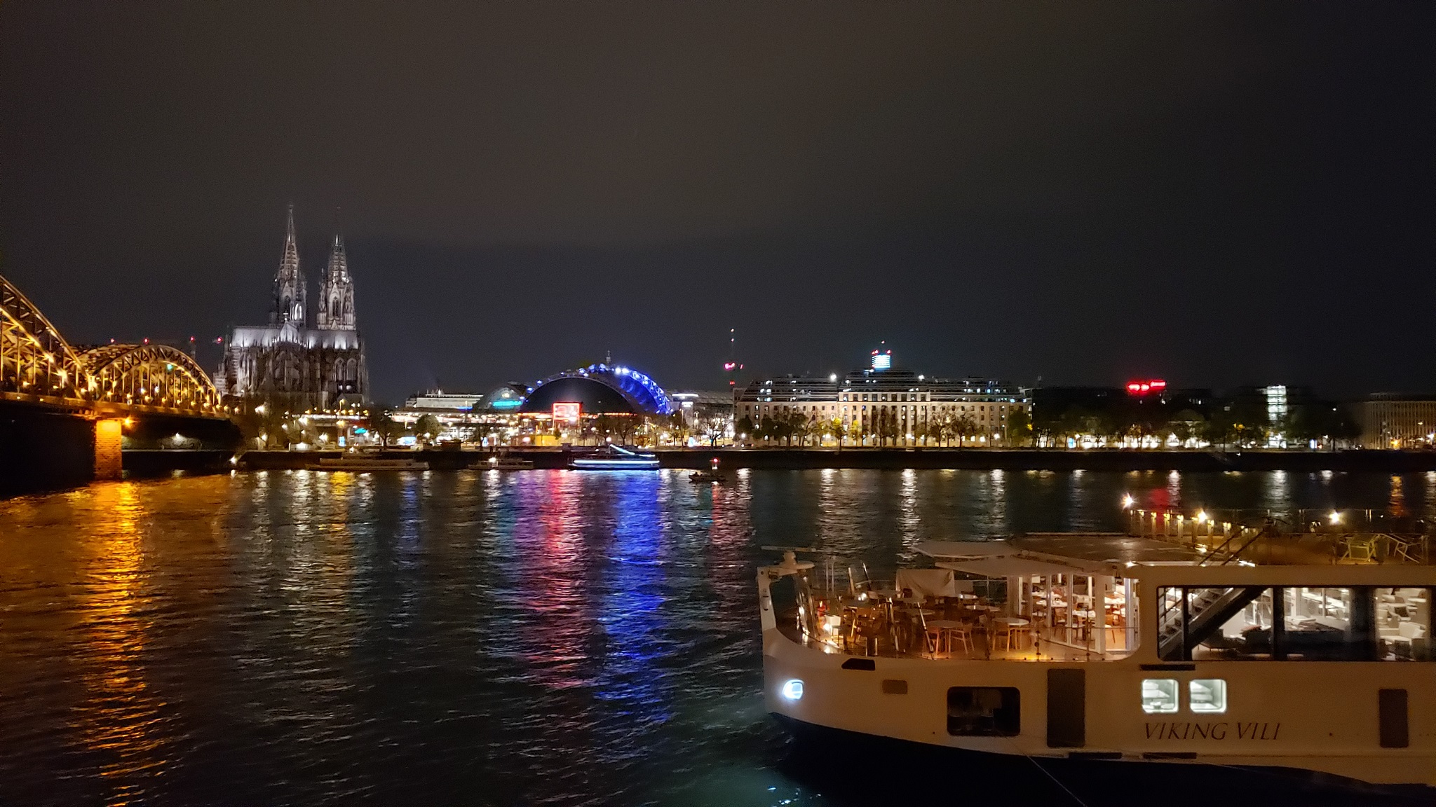 As a final treat, we remained in Cologne until 11:00 pm. The longship is docked right across the Rhine from the cathedral, so we were able to see everything beautifully lit up at night.