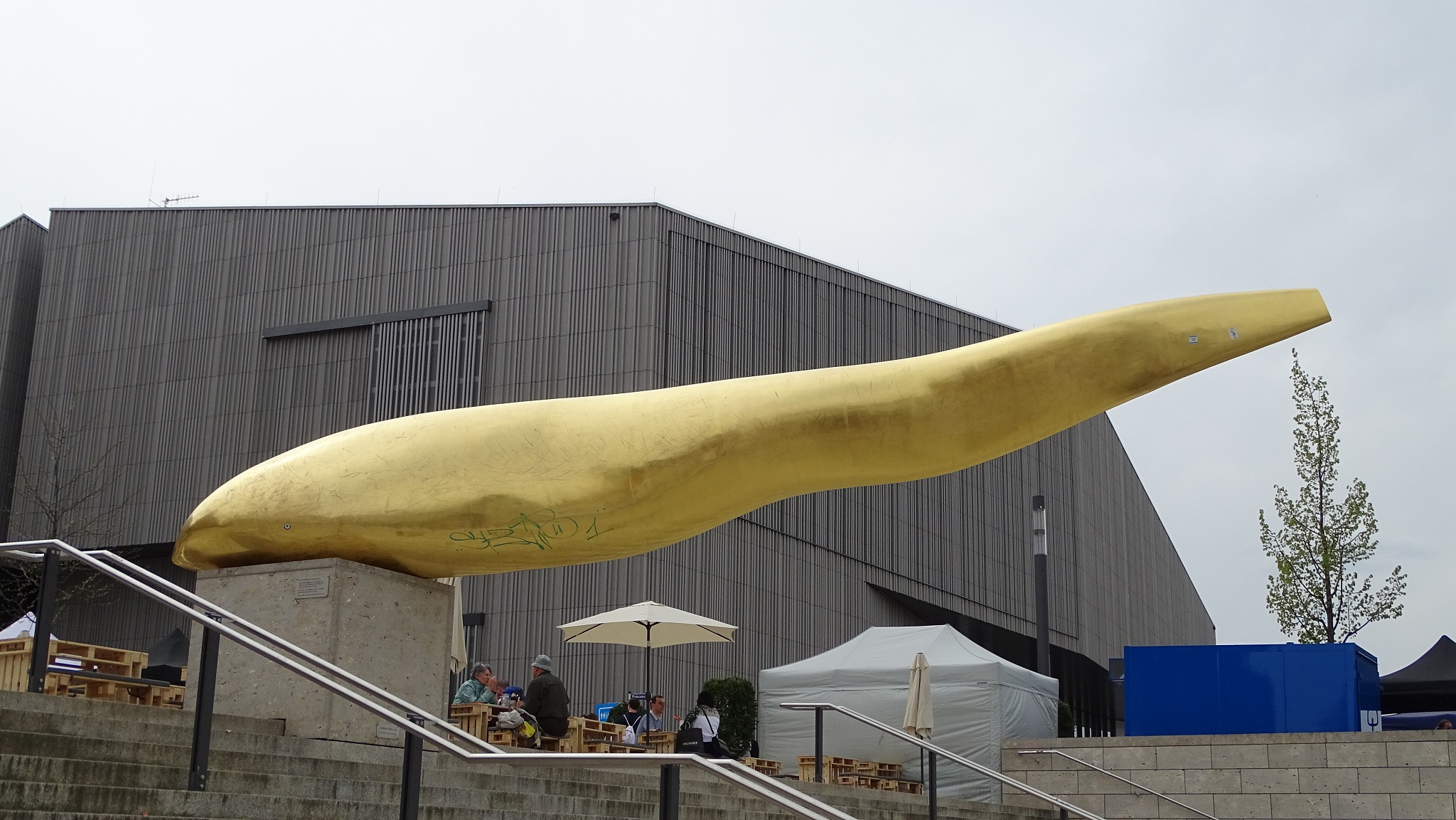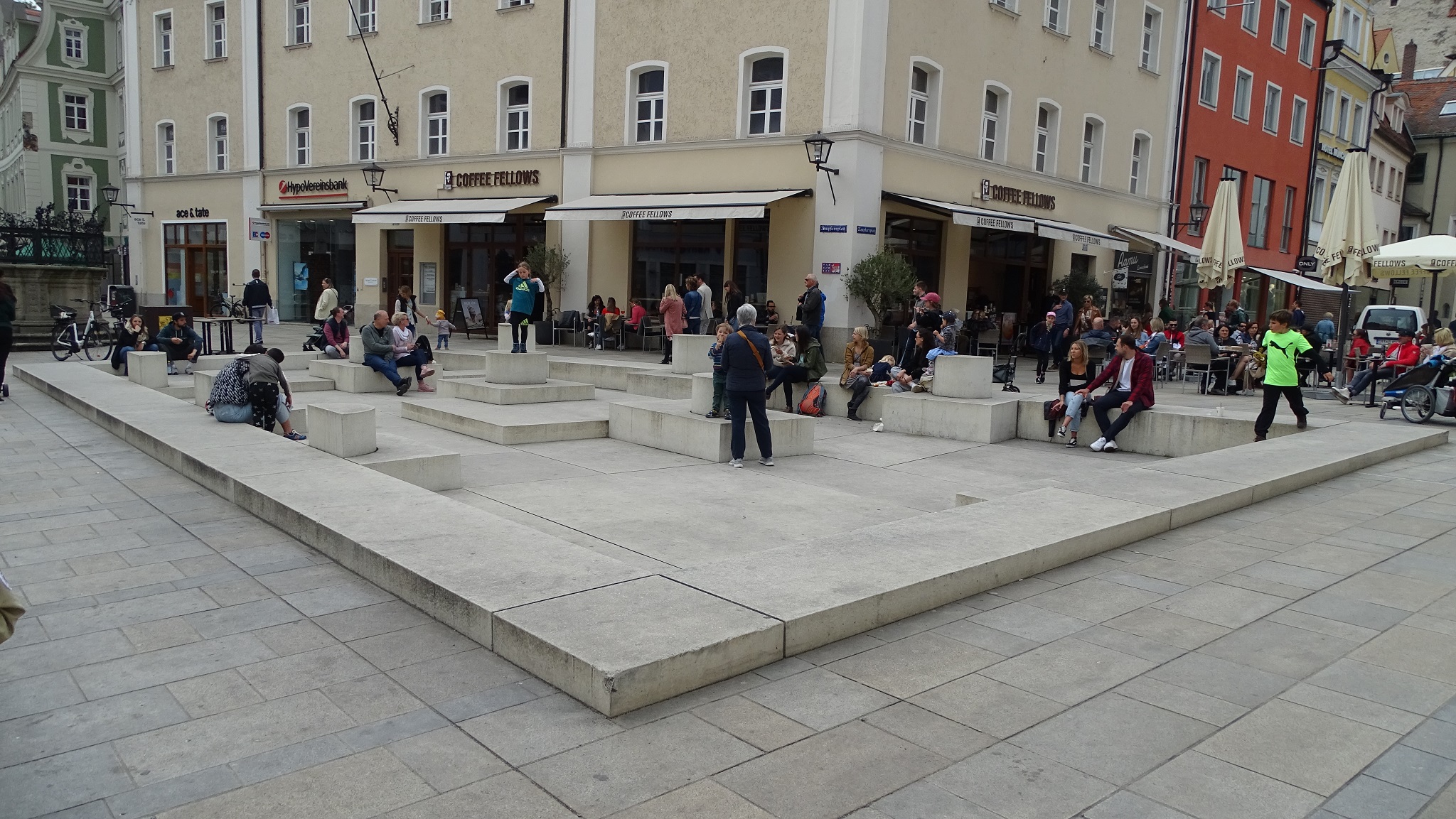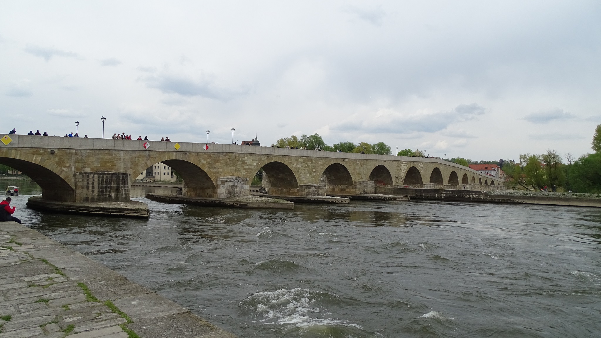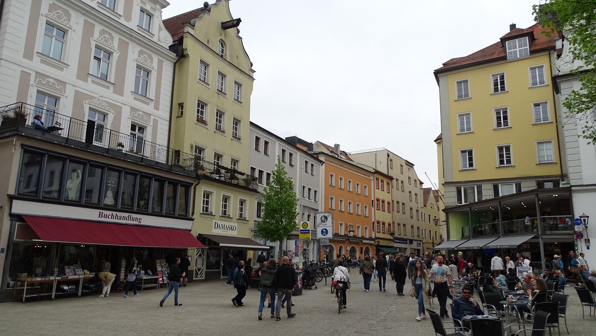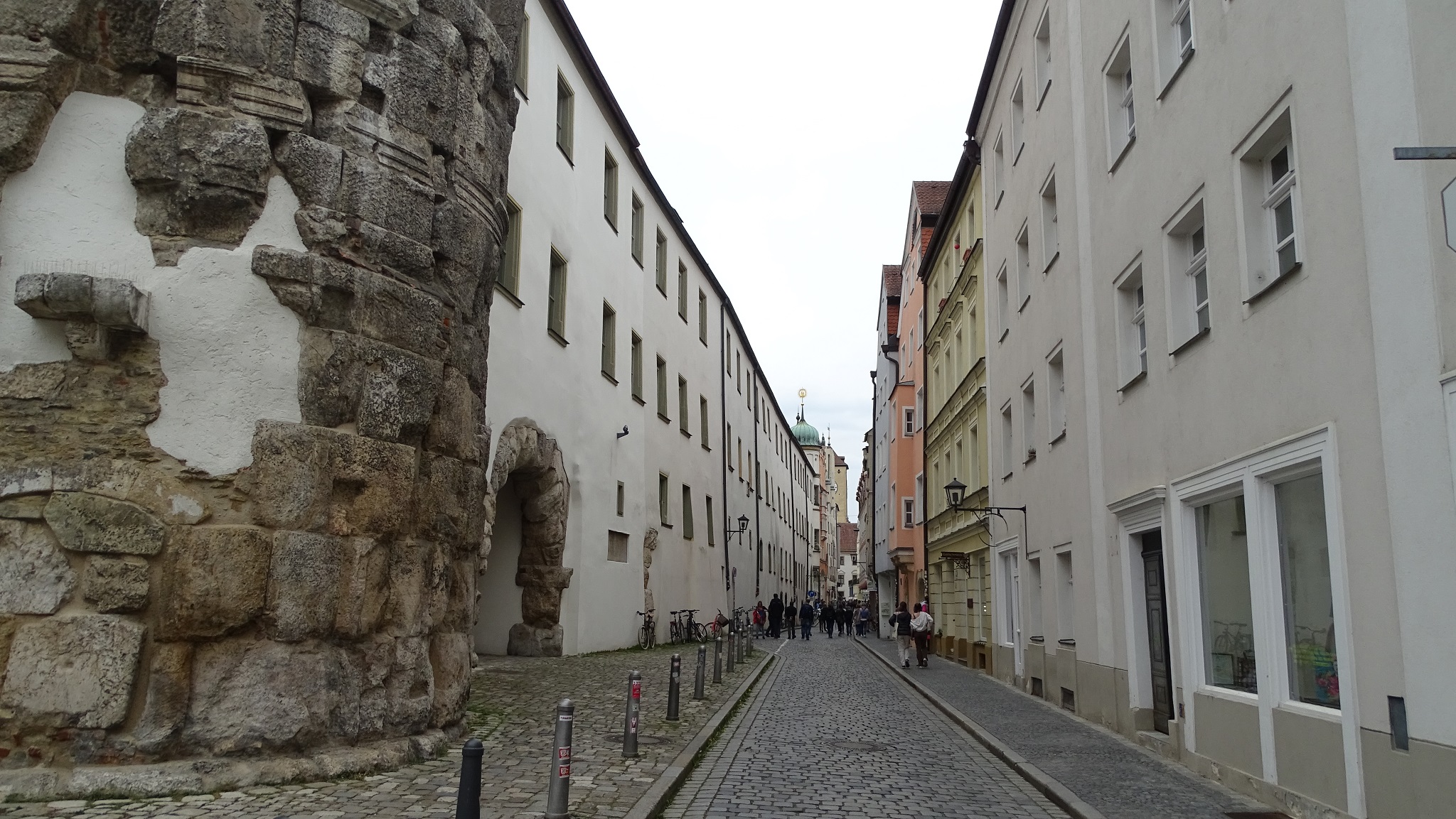 We signed up for a variant of the 90-minute included “Regensburg Walking Tour,” and embarked on the two-hour “Regensburg Jewish Walking Tour” excursion. From the dock, we had a long ten-minute walk along the riverfront to get into the city. (There were four Viking river longships docked here today.) And because today is Saturday, Regensburg was very crowded with weekend visitors.