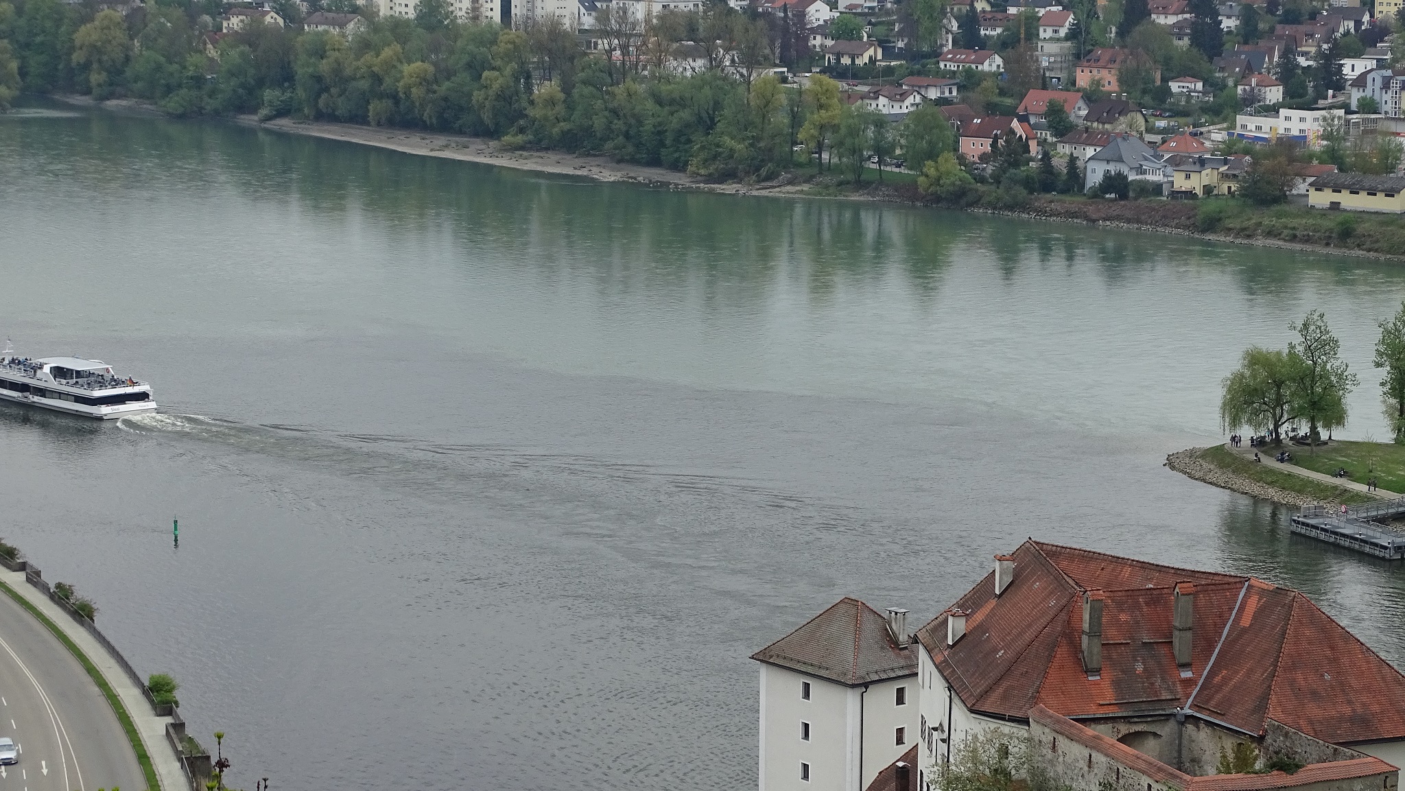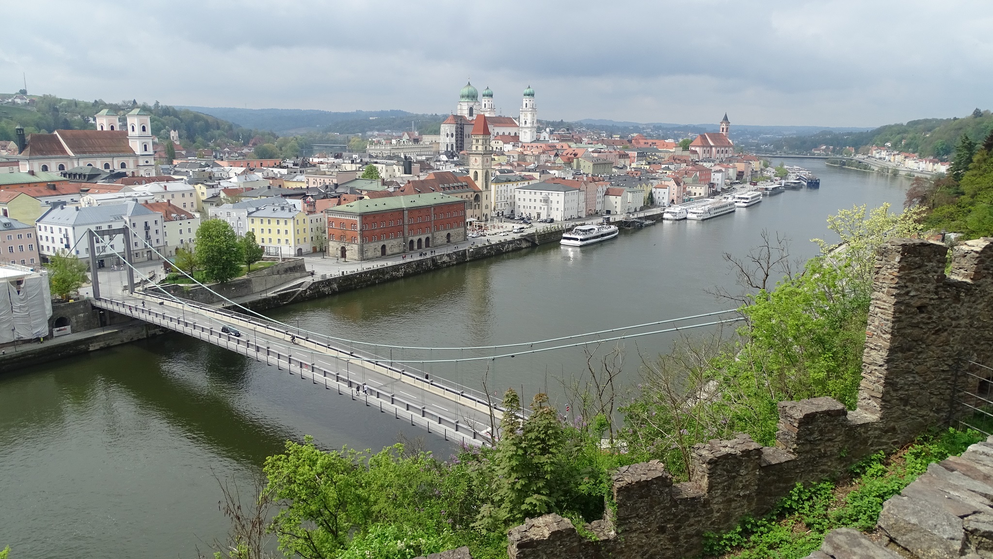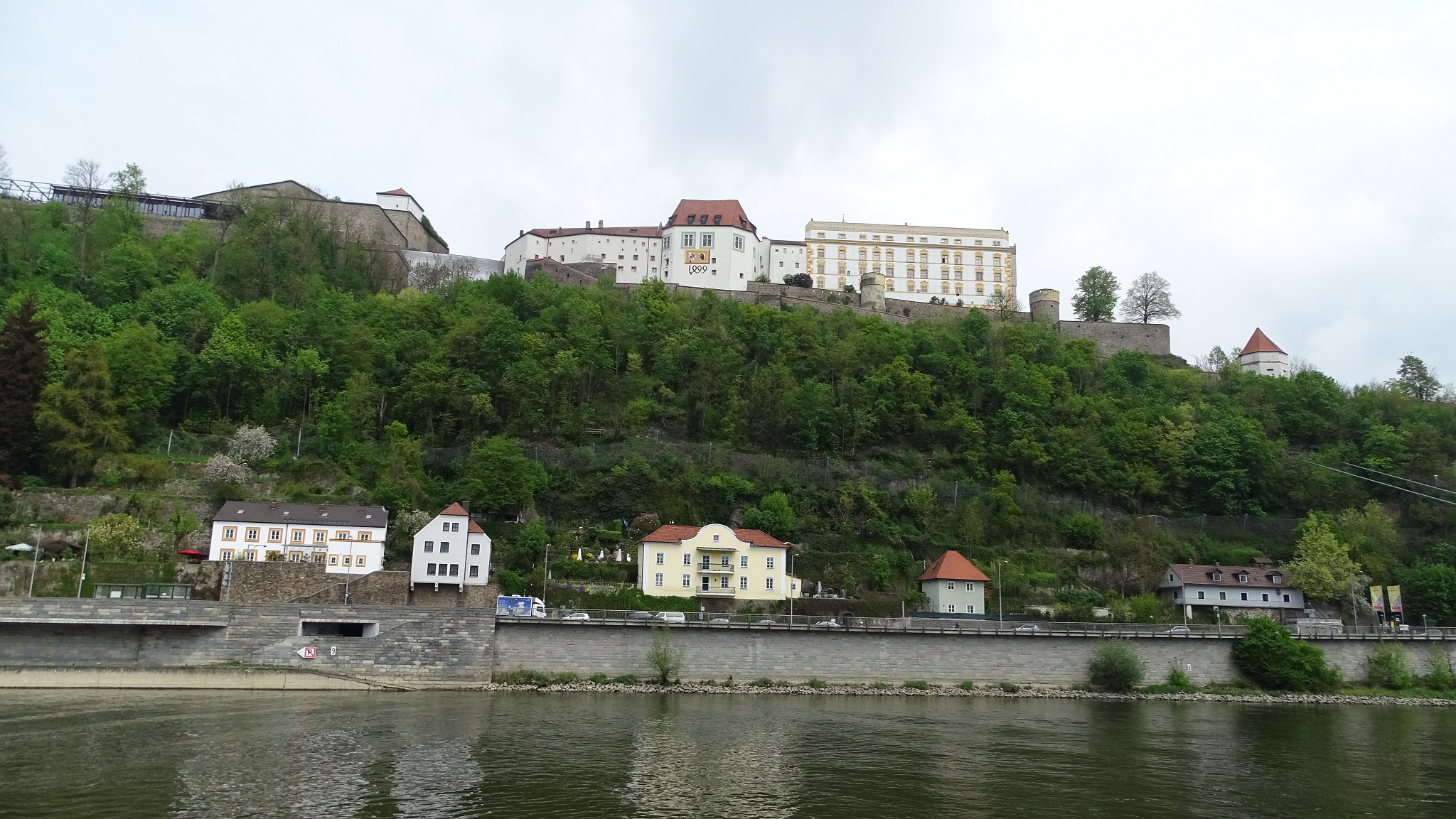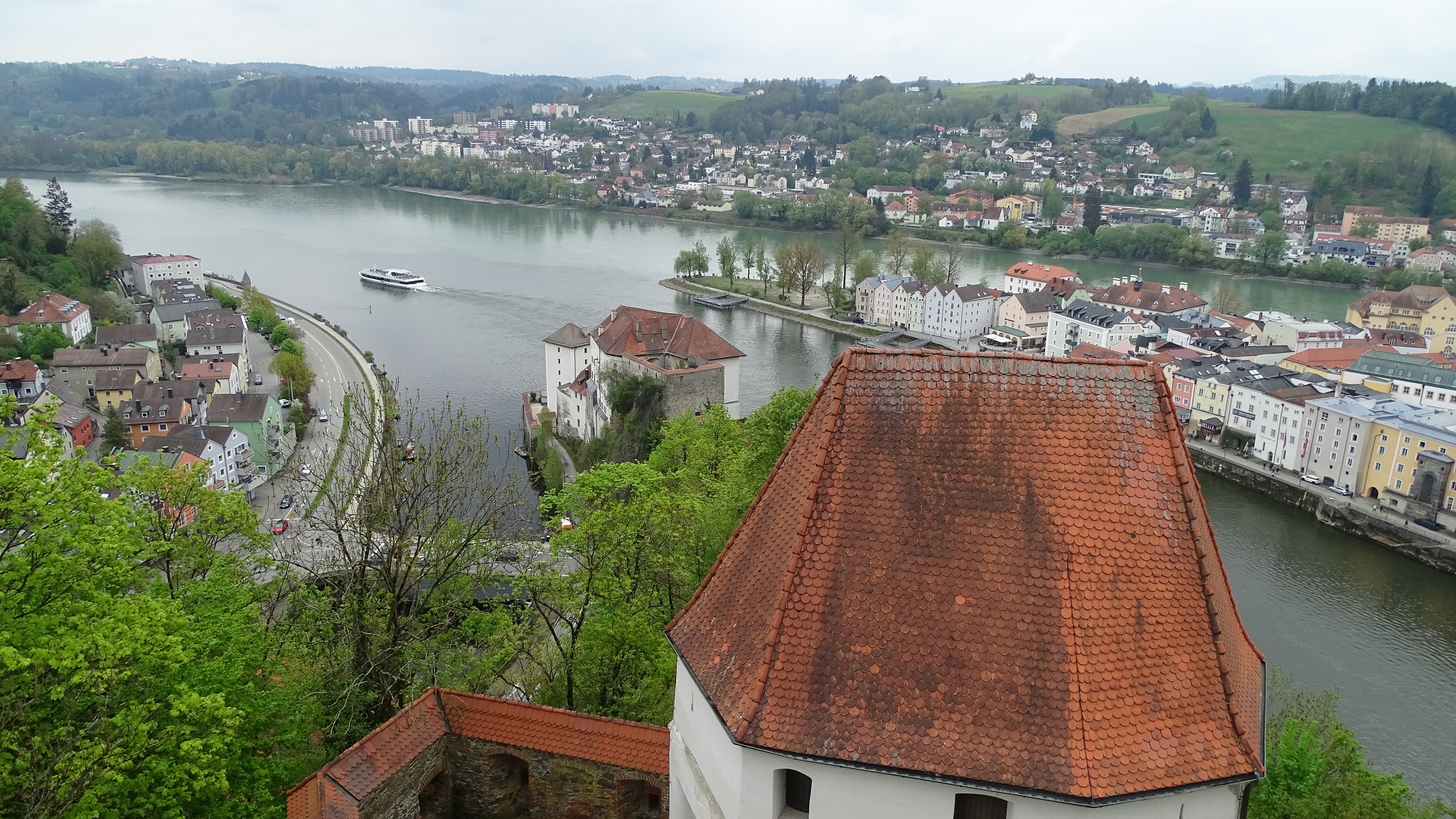 We descended all the way to the rivers, then climbed the hill on the north side of the Inn River to the Veste Oberhaus Fortress. This high fortress overlooks the confluence of the three rivers.