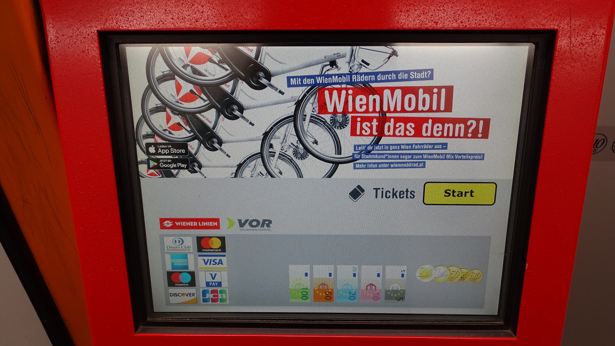 Tickets can be purchased at a kiosk using a credit card. Just touch “Start” to begin.