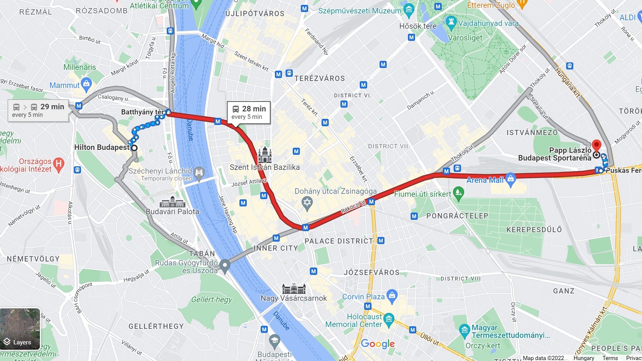 Luckily, we travel in the age of Google Maps. The app told us it would take 28 minutes to get to the venue: a 15-minute walk down Castle Hill to the Danube, followed by an 11-minute ride on the underground Metro, followed by a 3-minute walk to the arena.
