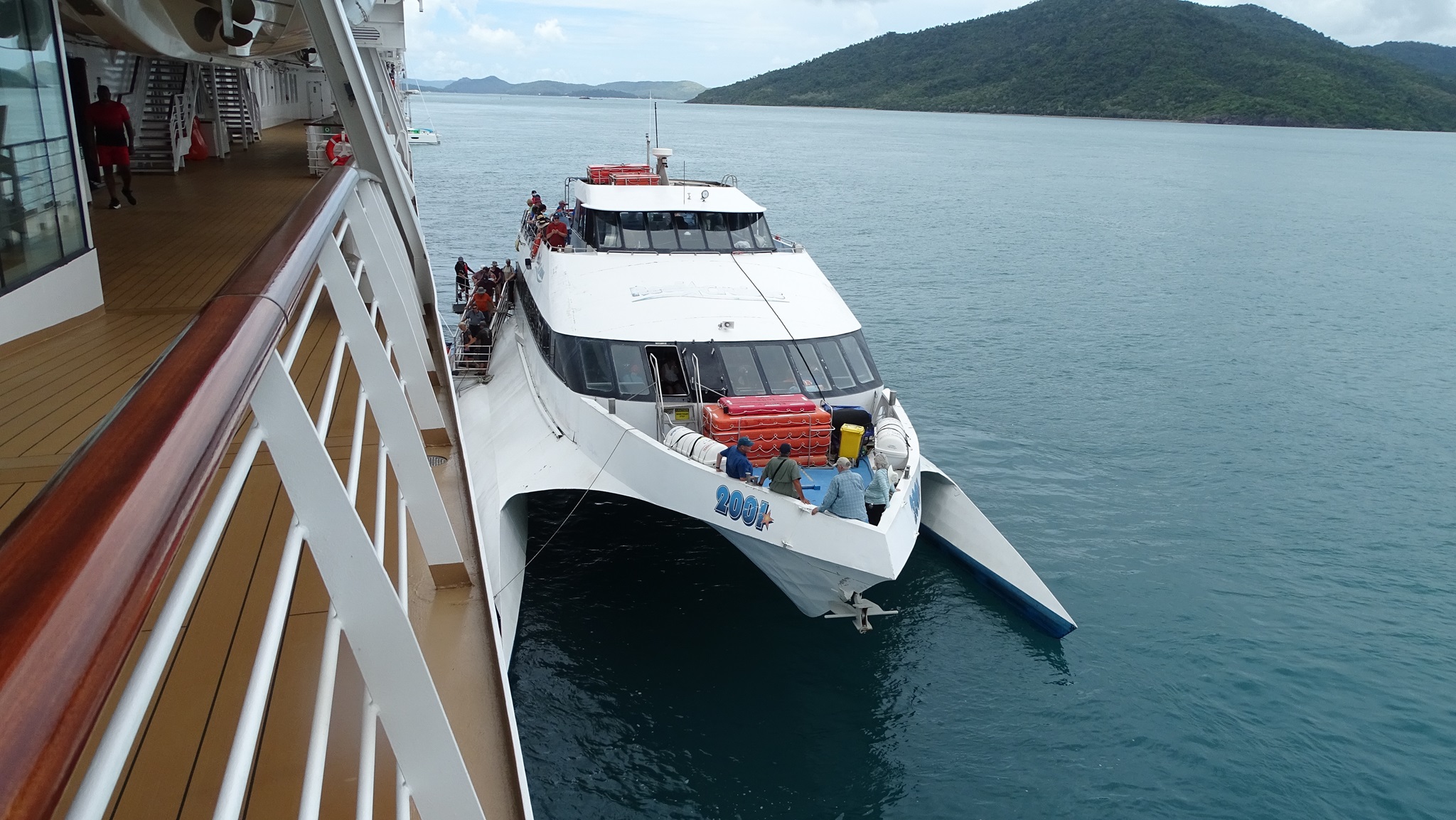 Once again, Russell and Gail were assigned to different excursions. Russell escorted Viking’s included tour, “Sailing the Whitsundays.” A chartered catamaran pulled up right alongside our cruise ship at anchor, so guests didn’t even need to go ashore. They spent two hours cruising leisurely through the area. The sky was foreboding, but the catamaran was able to avoid any of the distant rain.