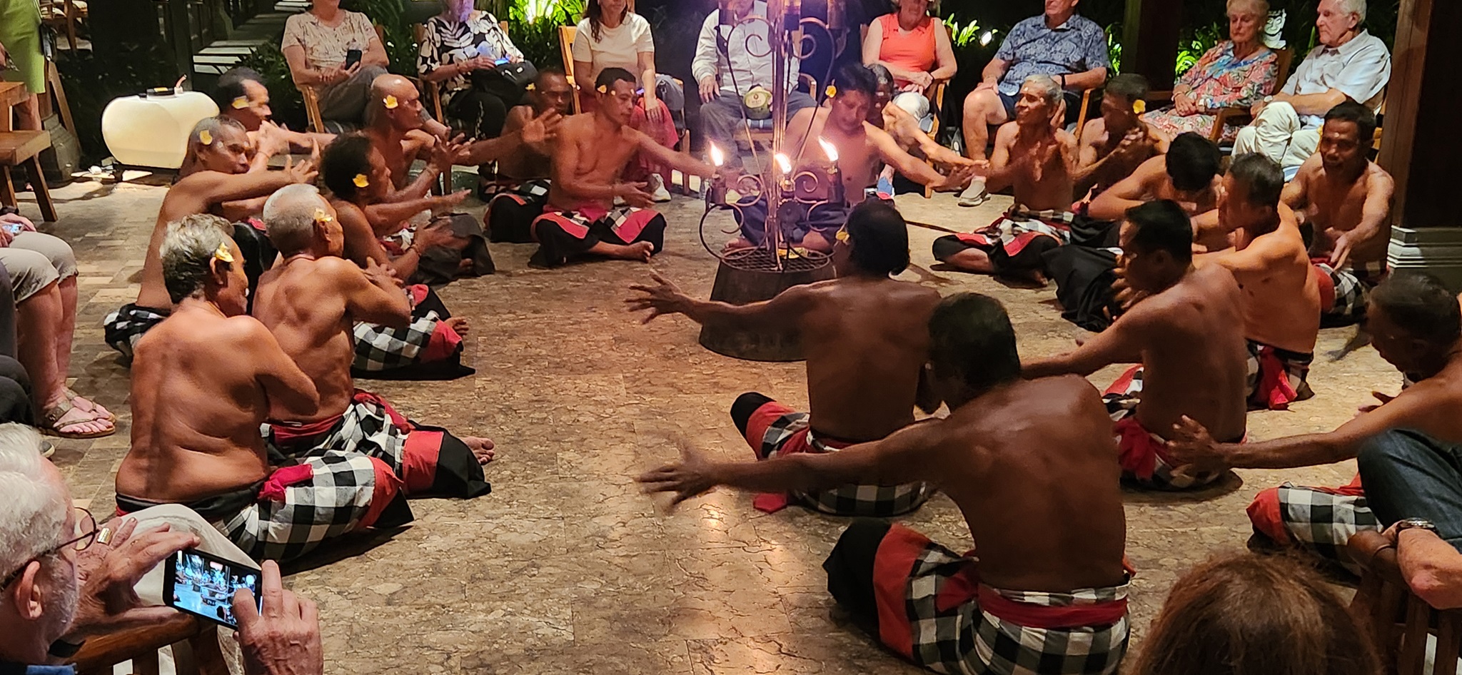 This style of performance is called “Kecak” (pronounced KAY-chack). On a stage lit only by glowing torches, a chorus of men chant and sway in a trance-like rhythm, repeating the sound “chack chack” over and over again. Colorfully costumed dancers weave their way among the chorus to act out the story in pantomime.