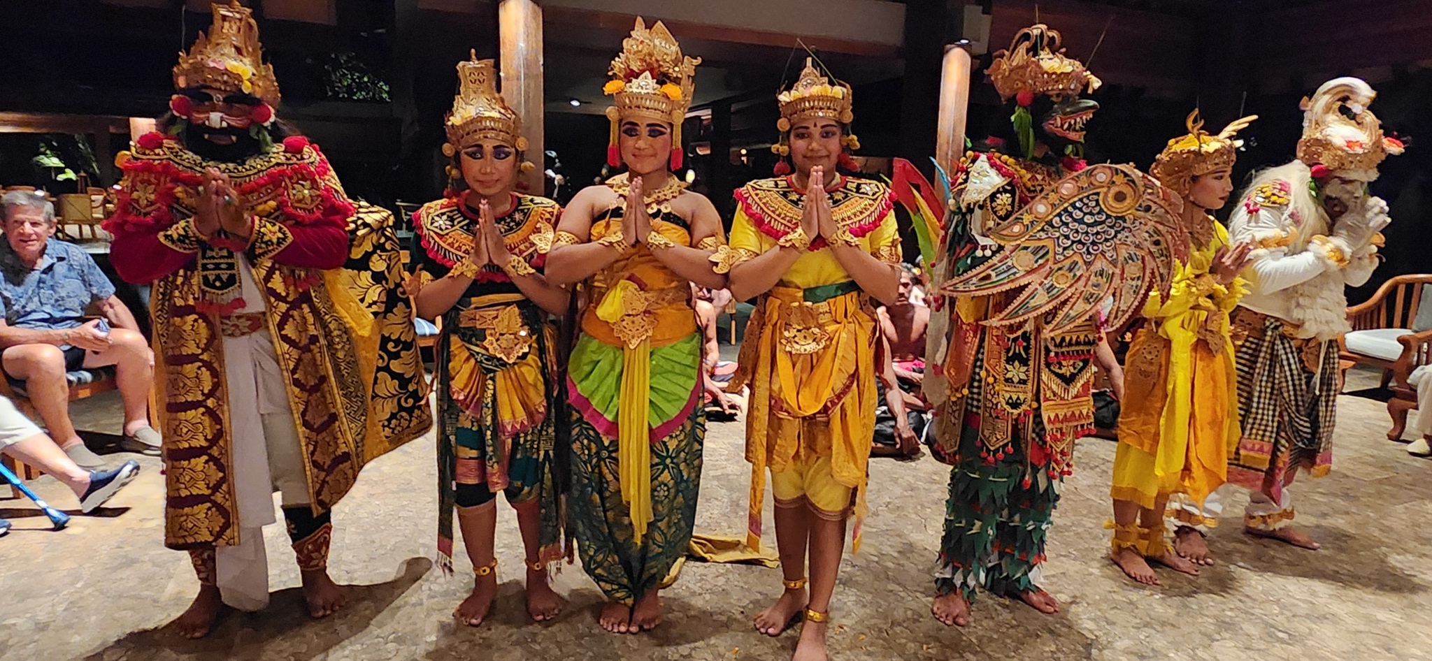 The dance show was based on a famous Hindu legend from the Ramayana, an historical work. (This is coincidentally the same story we saw last year at a Bali Bird Park dinner.) Prince Rāma leaves his wife Sītā in the care of his brother, Lakṣmaṇa. Unfortunately, the evil King Rāvaṇa has his eyes set on Sītā. An evil ally, Mārīca, disguises herself as a Golden Deer to distract Lakṣmaṇa. This enables evil King Rāvaṇa to kidnap Princess Sītā. Jatāyu the Vulture tries to rescue Sītā but is mortally wounded. Sītā is finally rescued with the help of Hanumān, the greatest of Ape Heroes.
